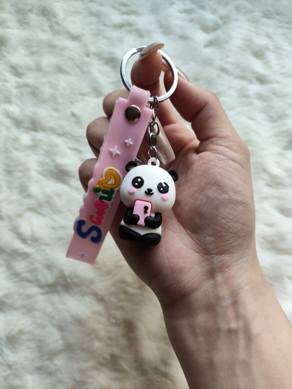 Pink Panda Silicone Keychain and Keyring with Mobile Phone